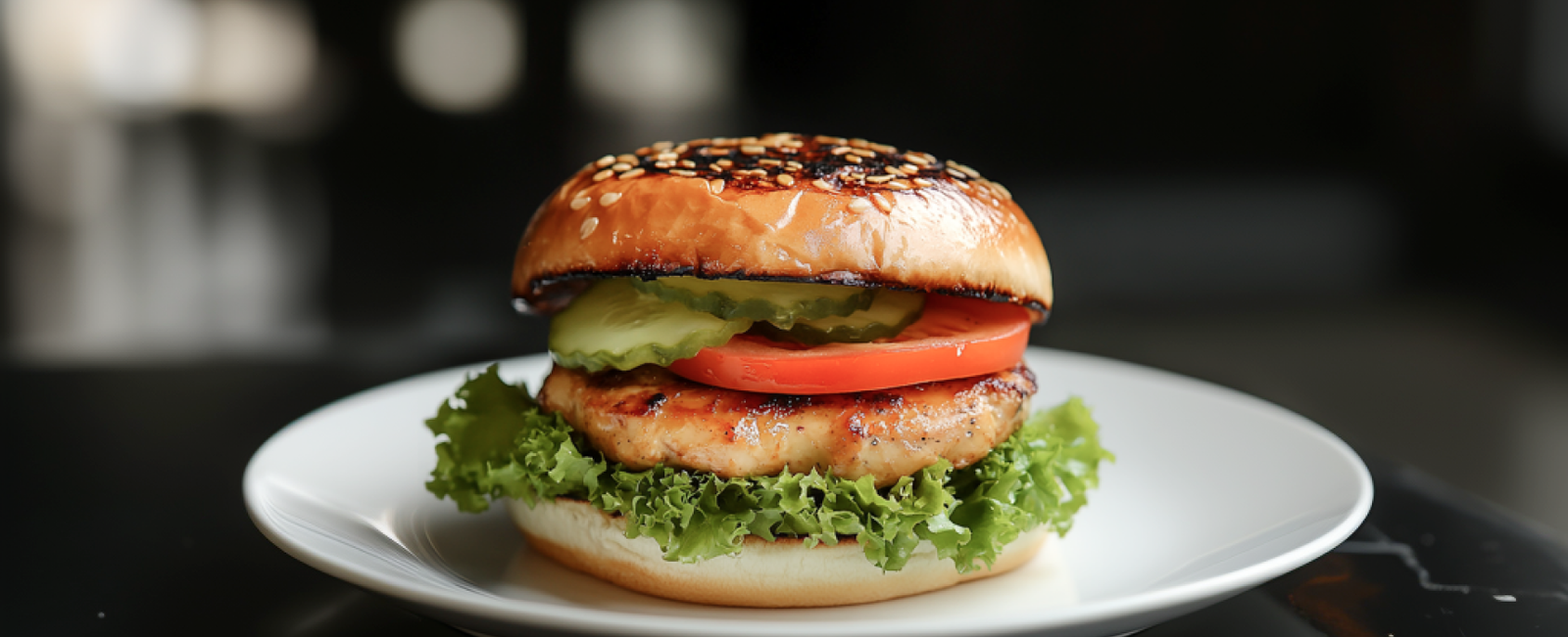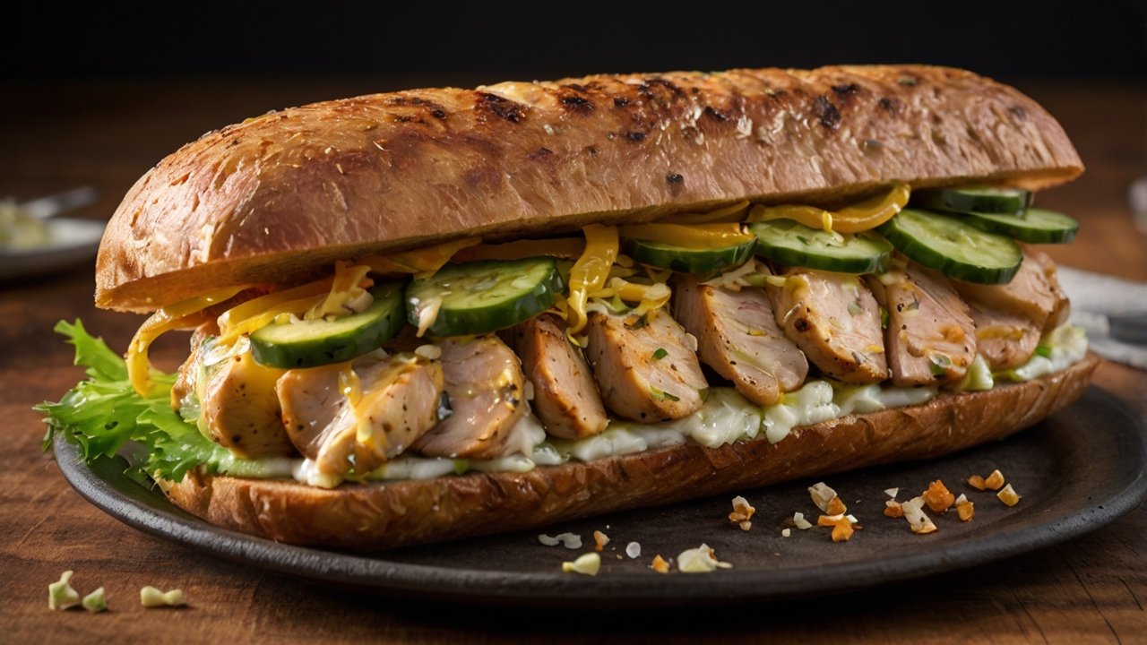 Sliced marinated sliced grilled chicken breast with lettuce, tomatoes, pickles, mayo and Swiss cheese.