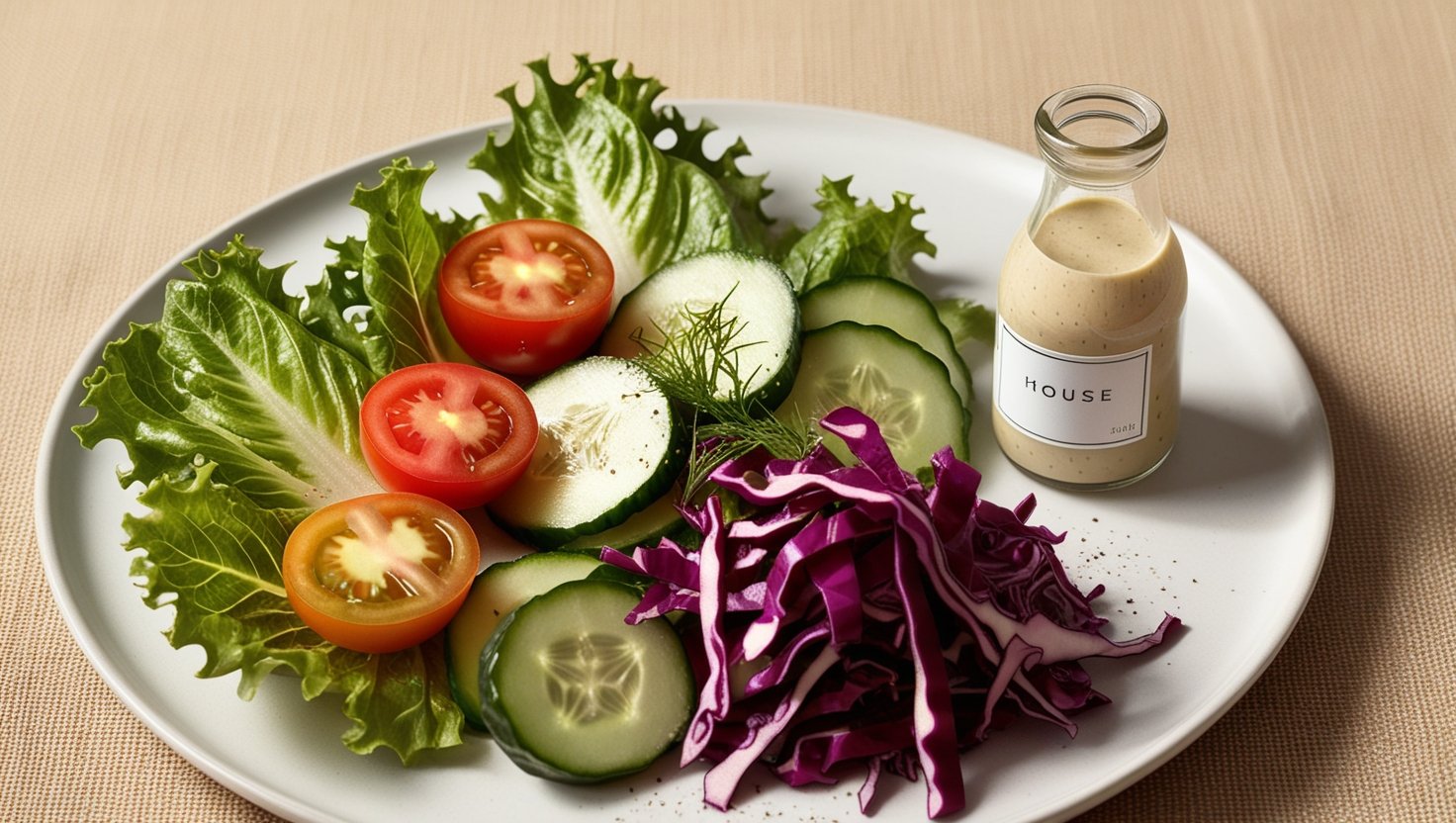 Lettuce, Tomatoes, Cucumber, Red Cabbage, and House Dressing.