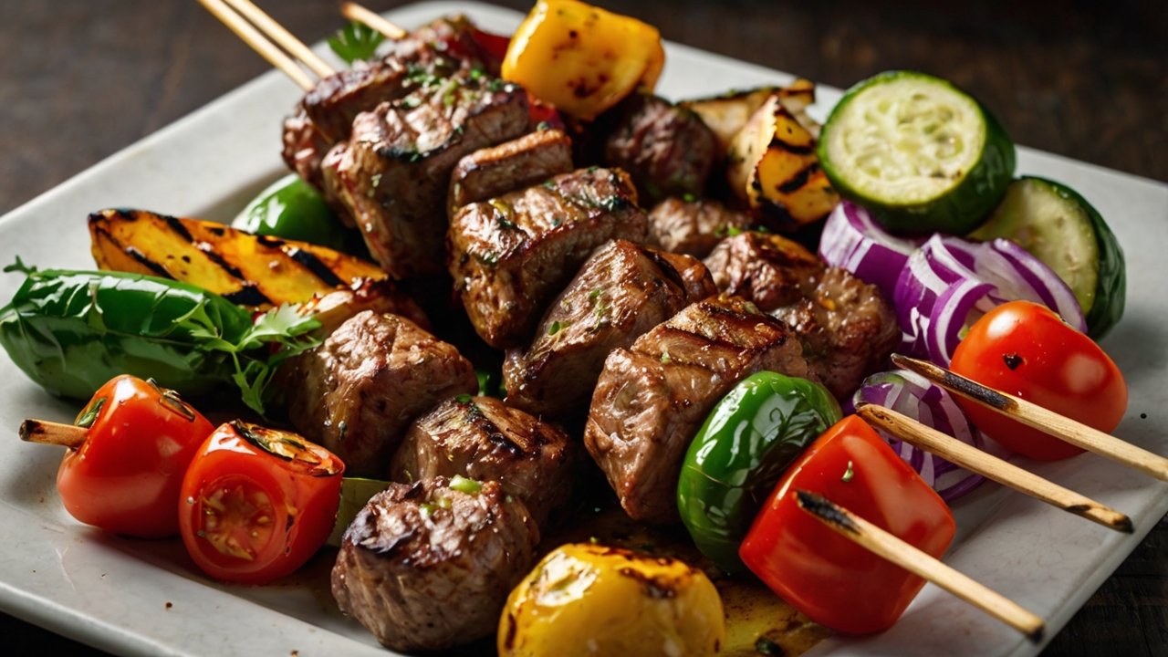 2 skewers of tenderloin marinated charbroiled with grilled veggies.