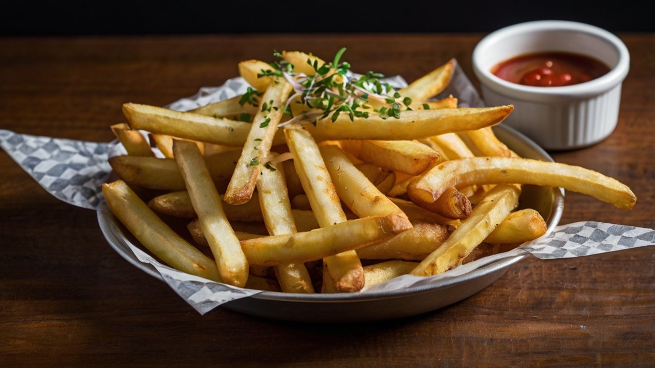 French fries with coleslaw, ketchup, garlic sauce and pickles.