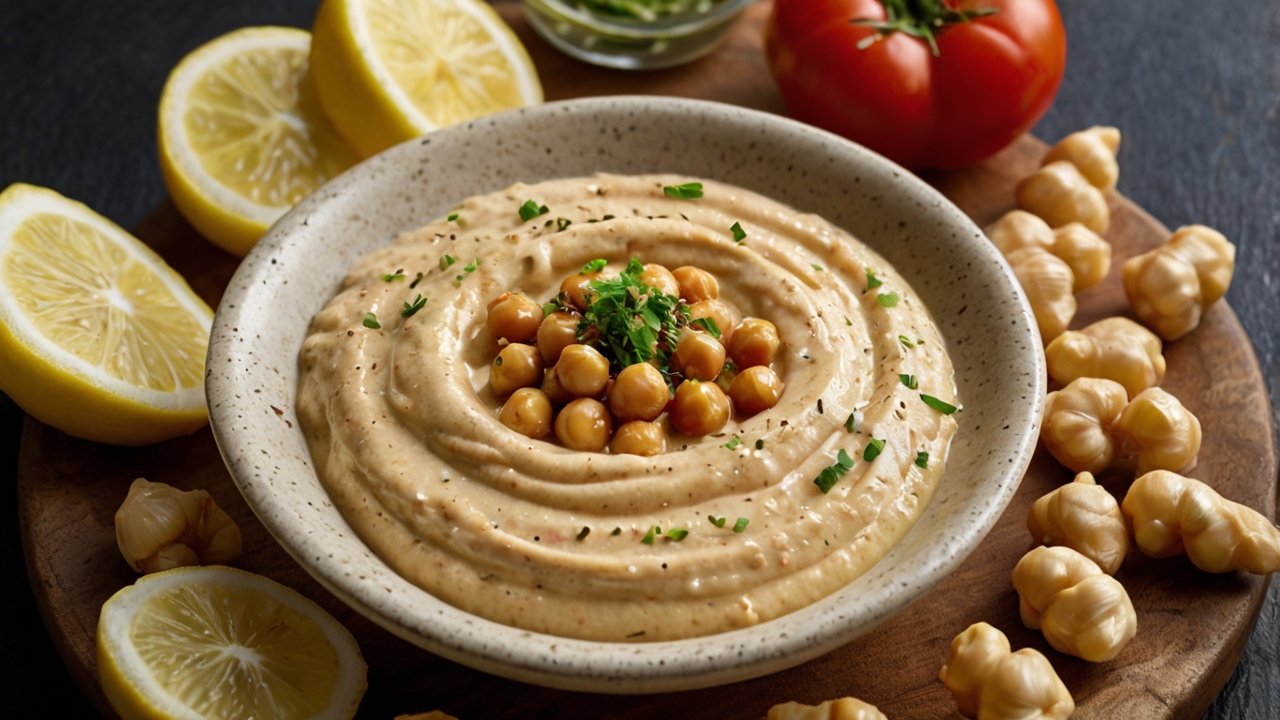 Chickpeas with sesame seed sauce, garlic, salt, lemon juice.
