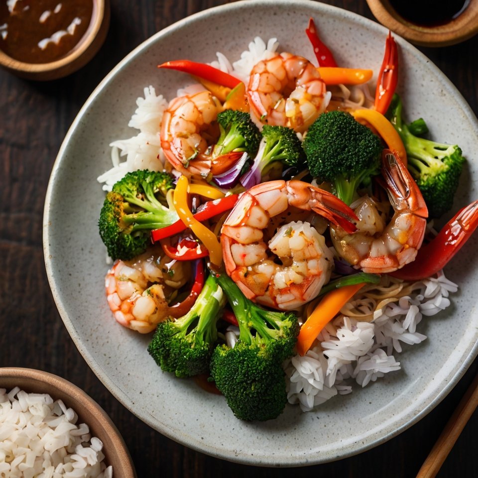 Marinated jumbo shrimps sautéed with onions, peppers, carrots, broccoli with teriyaki sauce and spice.
