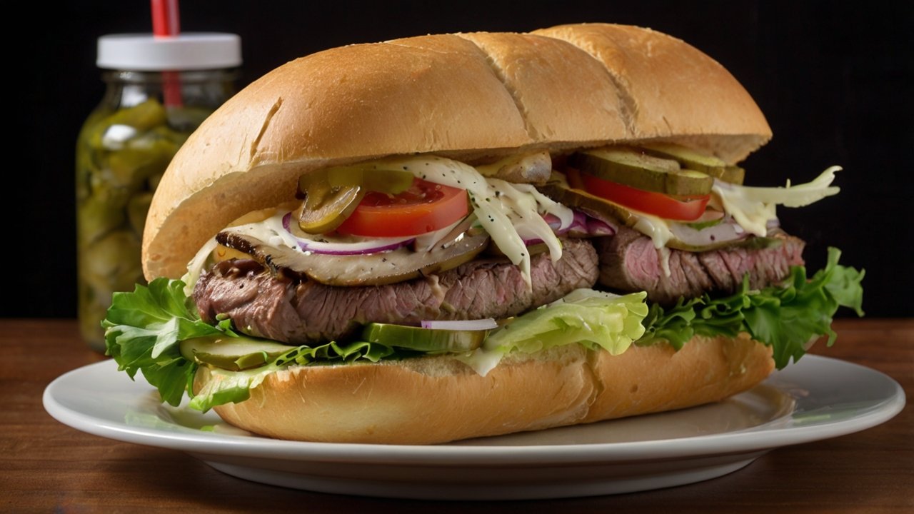 Seasoned grilled steak with onion, green pepper, mushrooms, Swiss cheese, lettuce, tomatoes, pickles and mayo.
